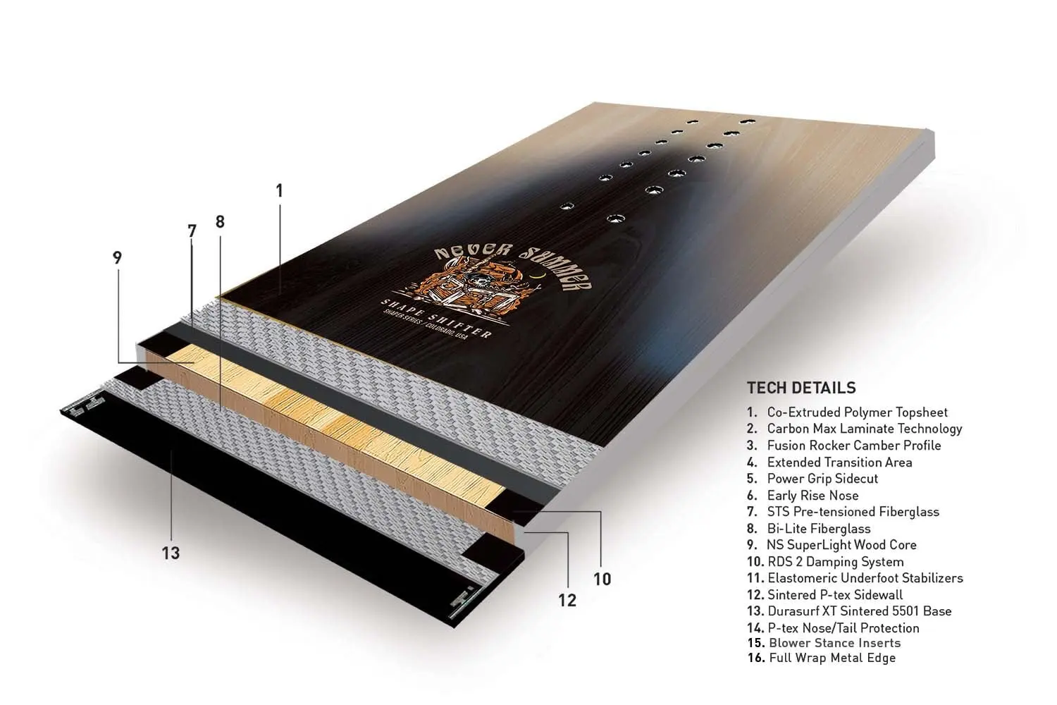 A combination of durable and lightweight woods create an unmatched strength to weight ratio. The worlds best snowboard fibreglass gives Never Summer boards their superior strength, edge hold and durability. Damping along the edges, underfoot and at the tip and tail provide stability at high speeds, and absorb vibrations.