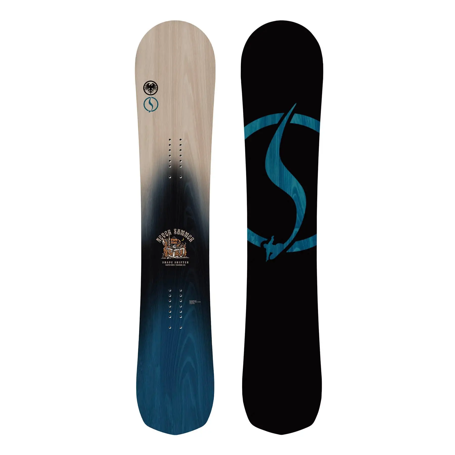 The 2024 Never Summer Shapeshifter is the next evolution of the Shaper, which was already a very versatile board that could truly handle any terrain. Now with a new nose shape and steeper kick, it still has all the features that made the Shaper a standout option. With a wider than normal width, Fusion Rocker Camber profile and 10mm of taper, you get super strong edge hold, a powerful flex with strong pop, and extra float in powder with the Blower Inserts. This is the one board where you won’t need to check the conditions for the day, just grab it and go!